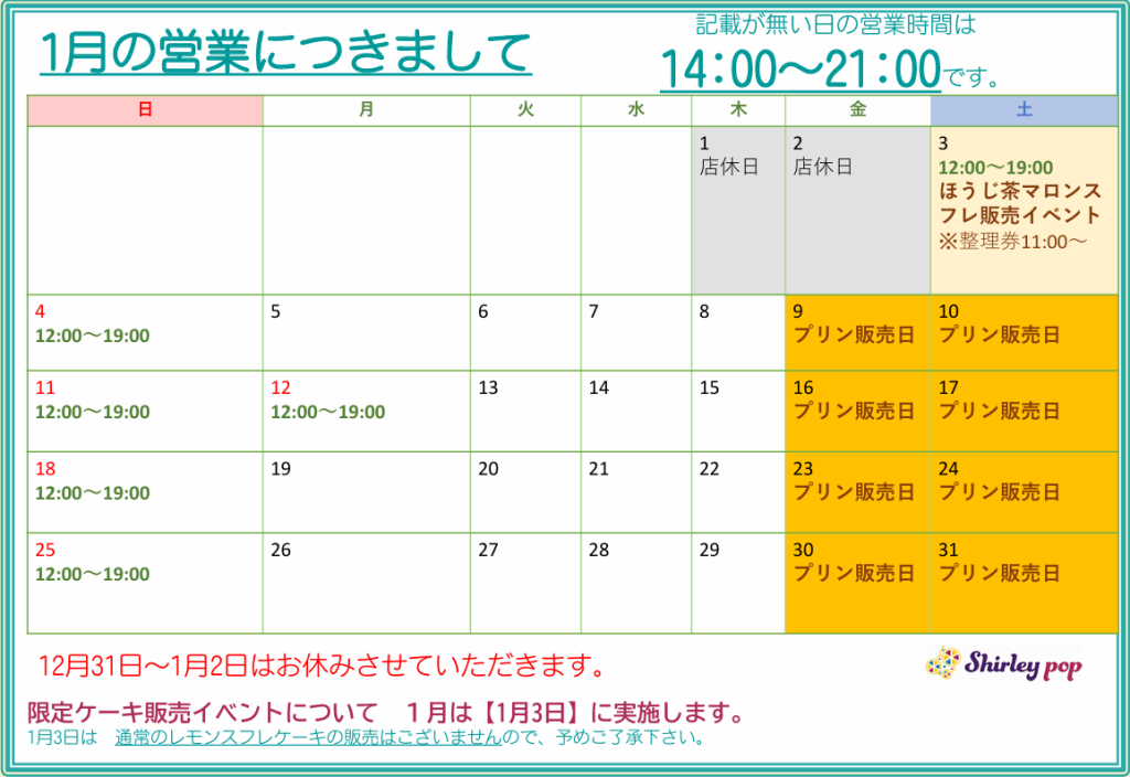 1月の営業につきまして 2025年12月27日 最終更新日時 : 2025年12月27日 shirleypop_admin Shirley popです♪ 2026年1月の営業についてお知らせいたします。 新年もお客様に焼きたてのチーズケーキをお客様にお楽しみいただけますよう、スタッフ一同がんばります! また新作のプリンやラスクの販売もございますので、 ケーキと一緒にぜひお求めください^^ ★普段 14:00~21:00 ★日曜、祝日と12月29日、30日、1月3日は12:00~19:00 ★12月31日~1月2日は休業いたします。 夕方~夜にかけても焼きたてをご用意しておりますので、ご来店もお待ちしております! Follow me! FacebookXBlueskyHatenaPocketCopy