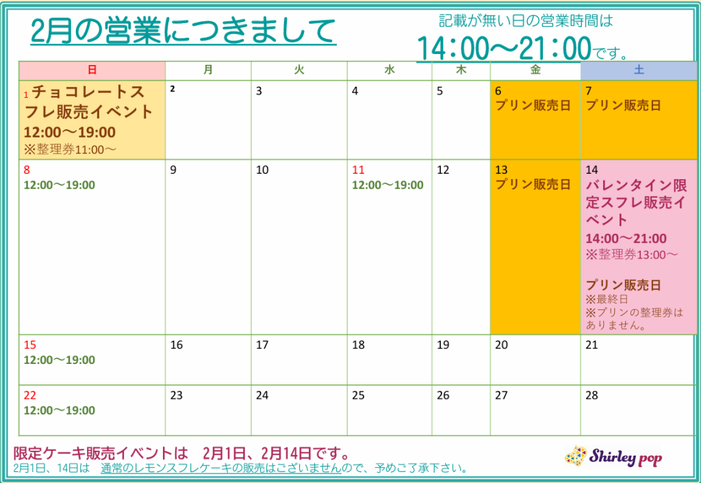 2月の営業につきまして 2026年1月29日 最終更新日時 : 2026年1月26日 shirleypop_admin 1月は寒い中ご来店ありがとうございます! まだまだ寒さが続きますが、 節分やバレンタイン等 美味しい食べ物のイベントも盛りだくさんな2月がやってまいります♪ バレンタインのイベントは・・・後日お知らせします!! Shirleypopも元気に営業しますので是非お越しください! 週末だけのなめらかプリンも、最終日が近づいているので、合わせてご確認下さい。 営業時間につきまして ★普段 14:00~21:00 ★日・祝 12:00~19:00 Follow me! FacebookXBlueskyHatenaPocketCopy