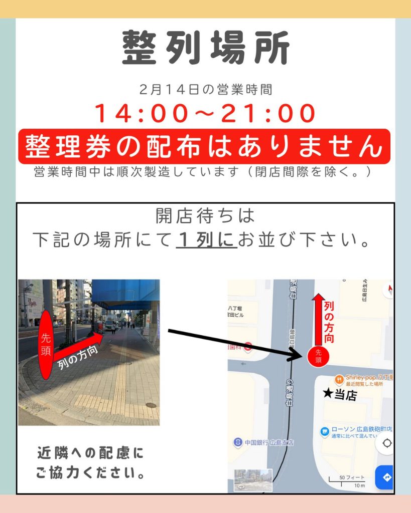 ※開店前にお越しの場合は、画像の場所に1列でお並びください。